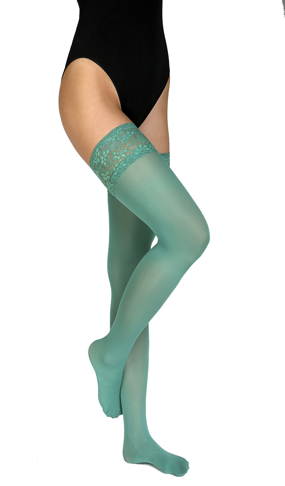 Glatte blickdichte halterlose Strümpfe mit elegantem, floral gemustertem Spitzenabschluss, aus weicher Microfaser, matt, 60 denier. Erhältlich in vielen modischen Farben und auch in Übergrößen.