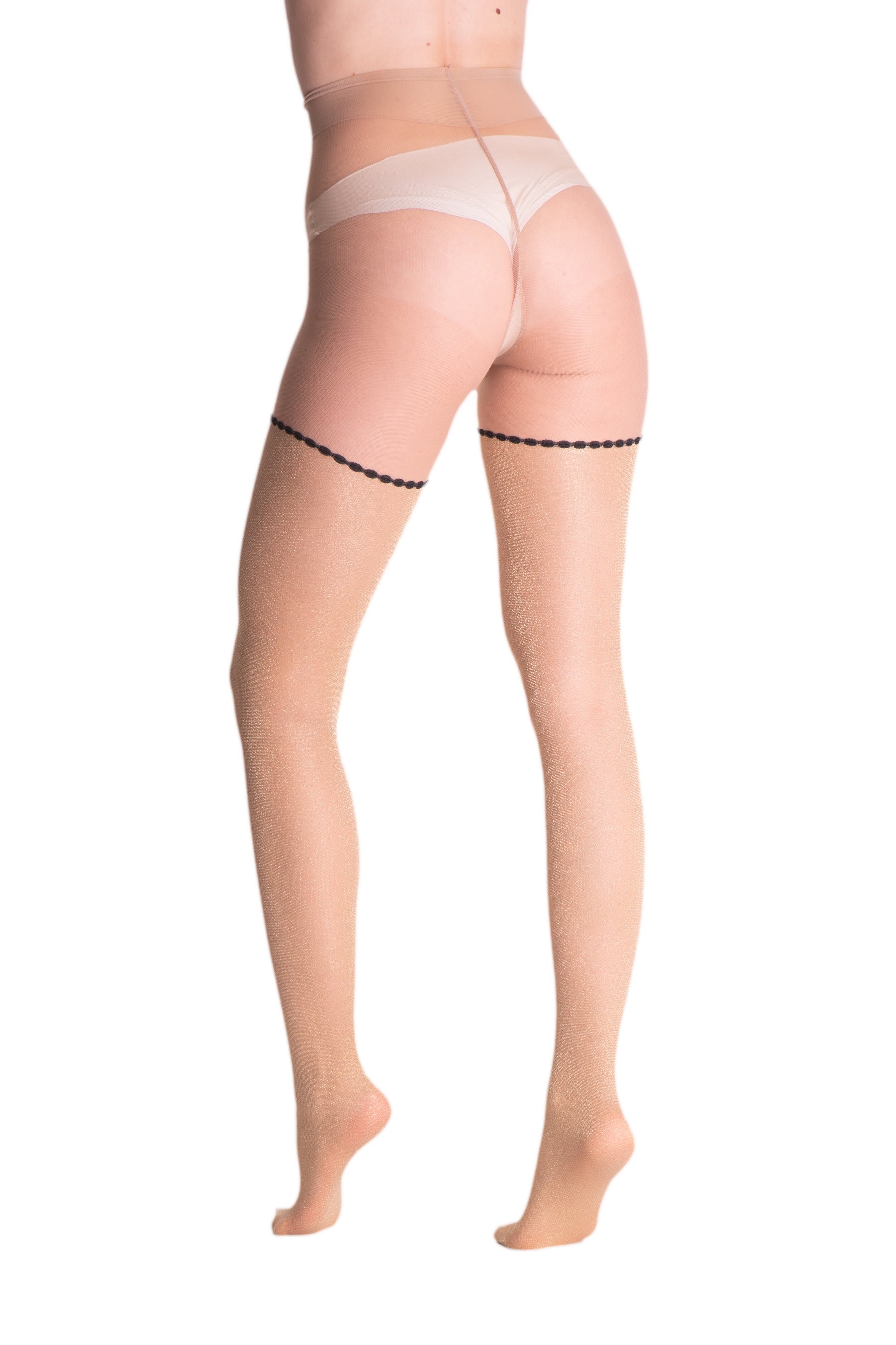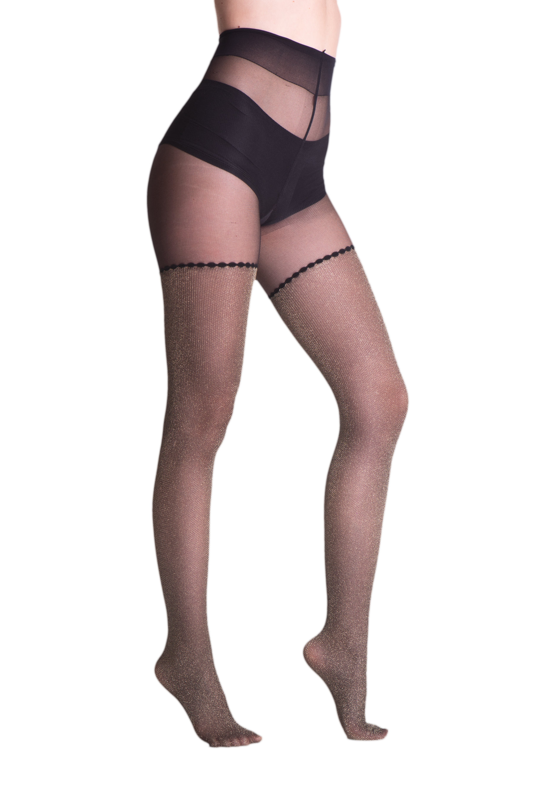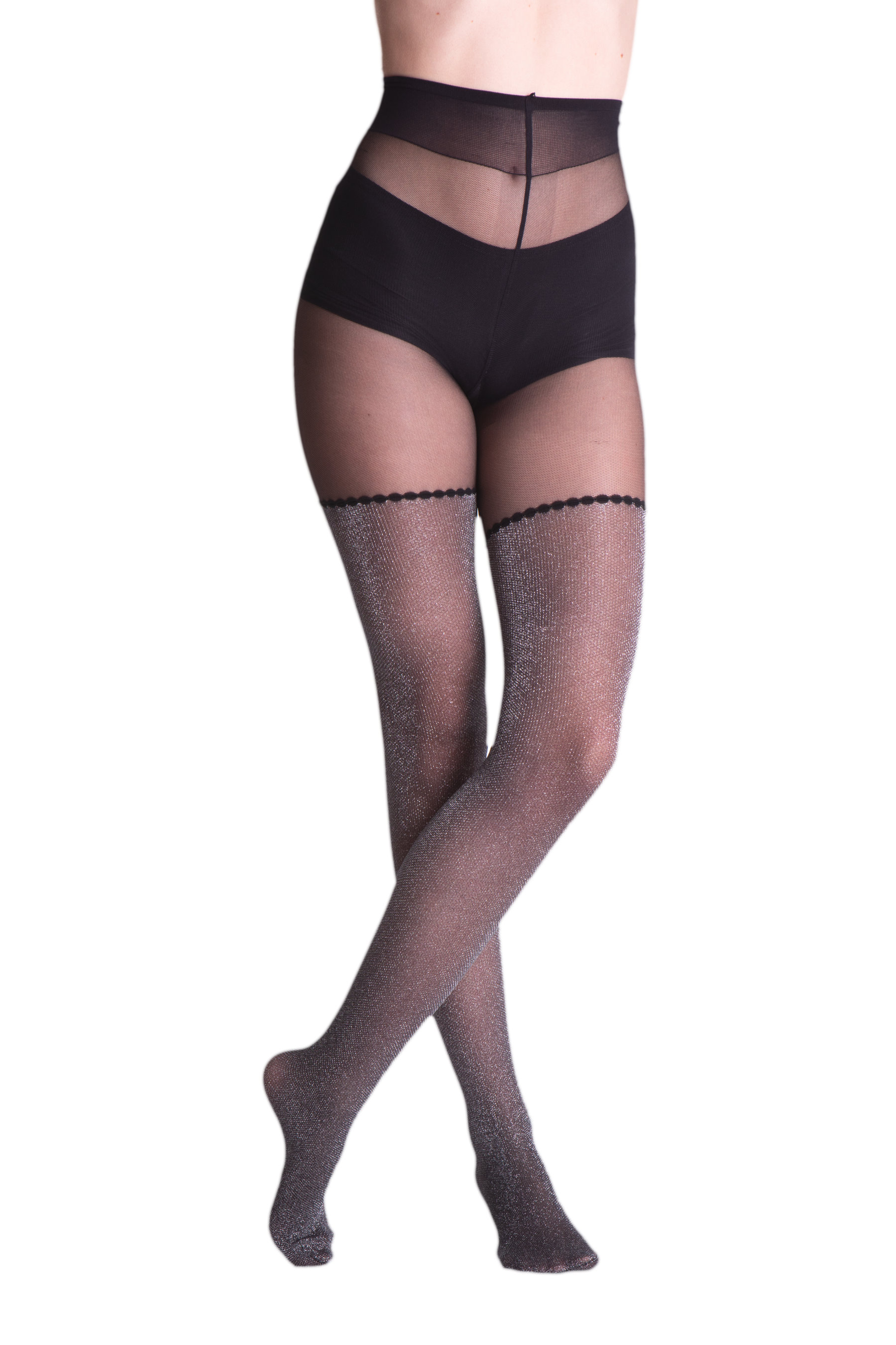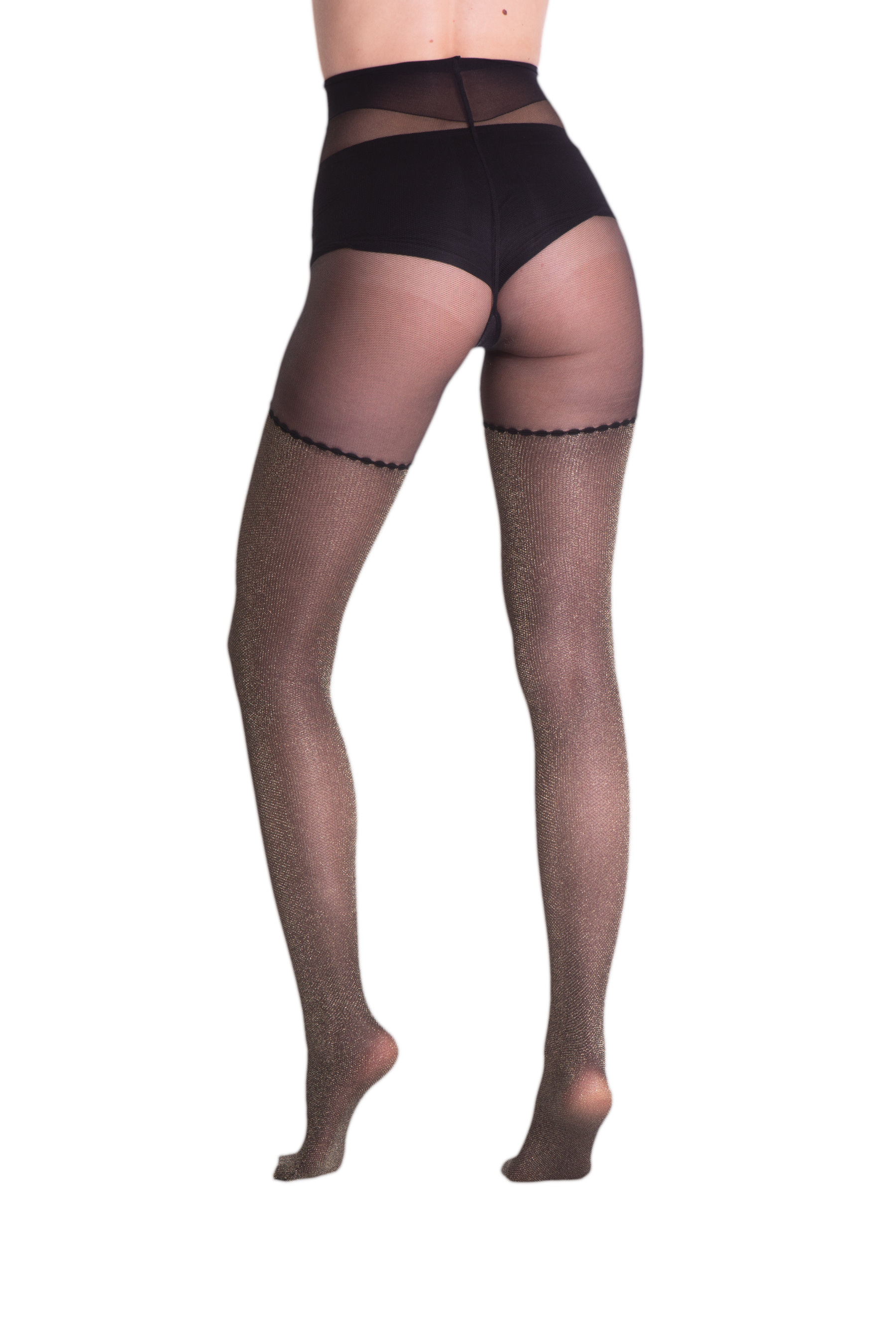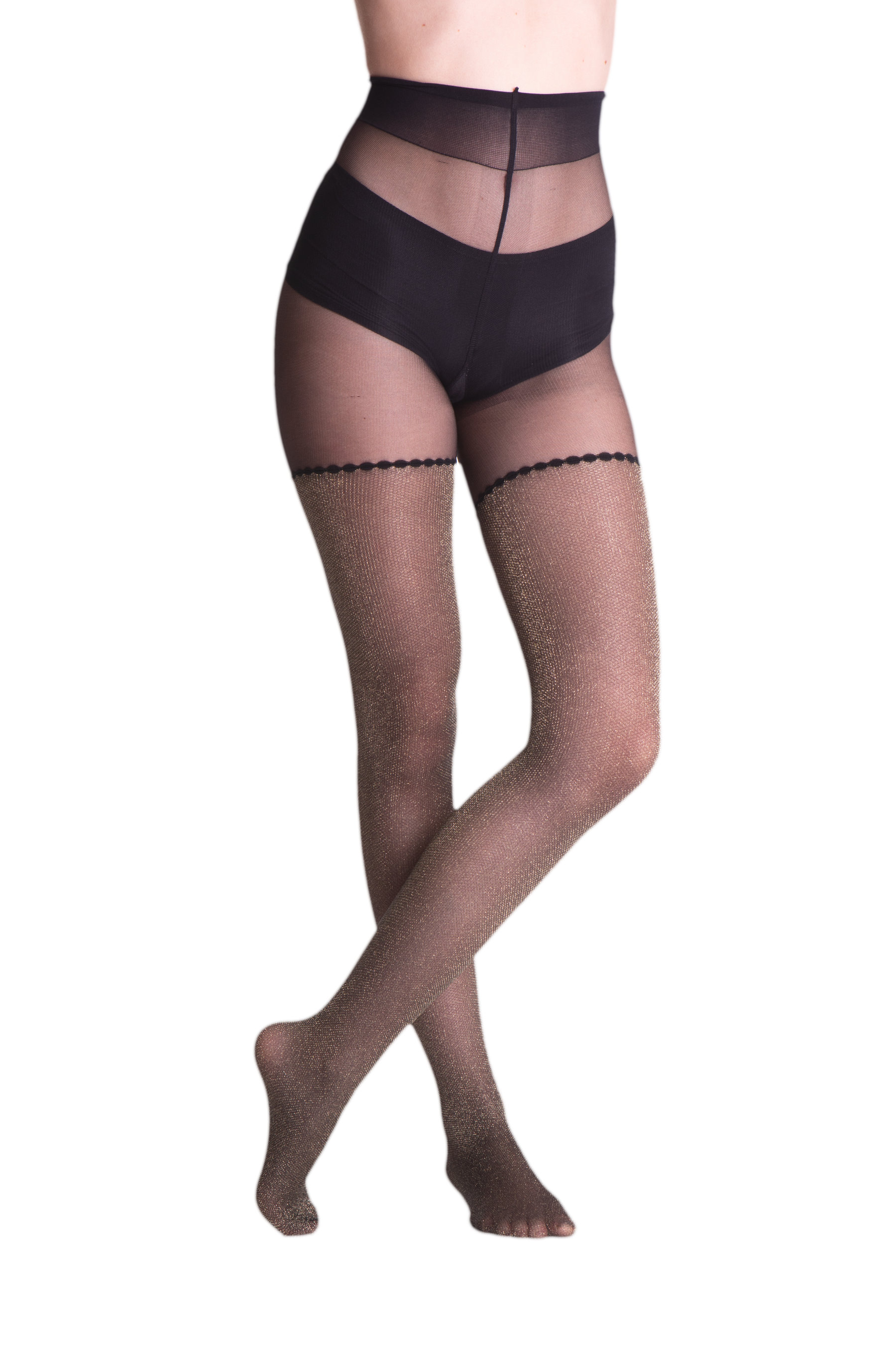 Glamourös schimmernde Feinstrumpfhose mit Lurex-Effekt und angesagter Strumpfoptik. Ein elegantes und sinnliches Stück, das den Beinen Glanz verleiht, ohne zu übertreiben. Definitiv geeignet für die schicksten Abende oder Anlässe, an denen Sie glänzen möchten.