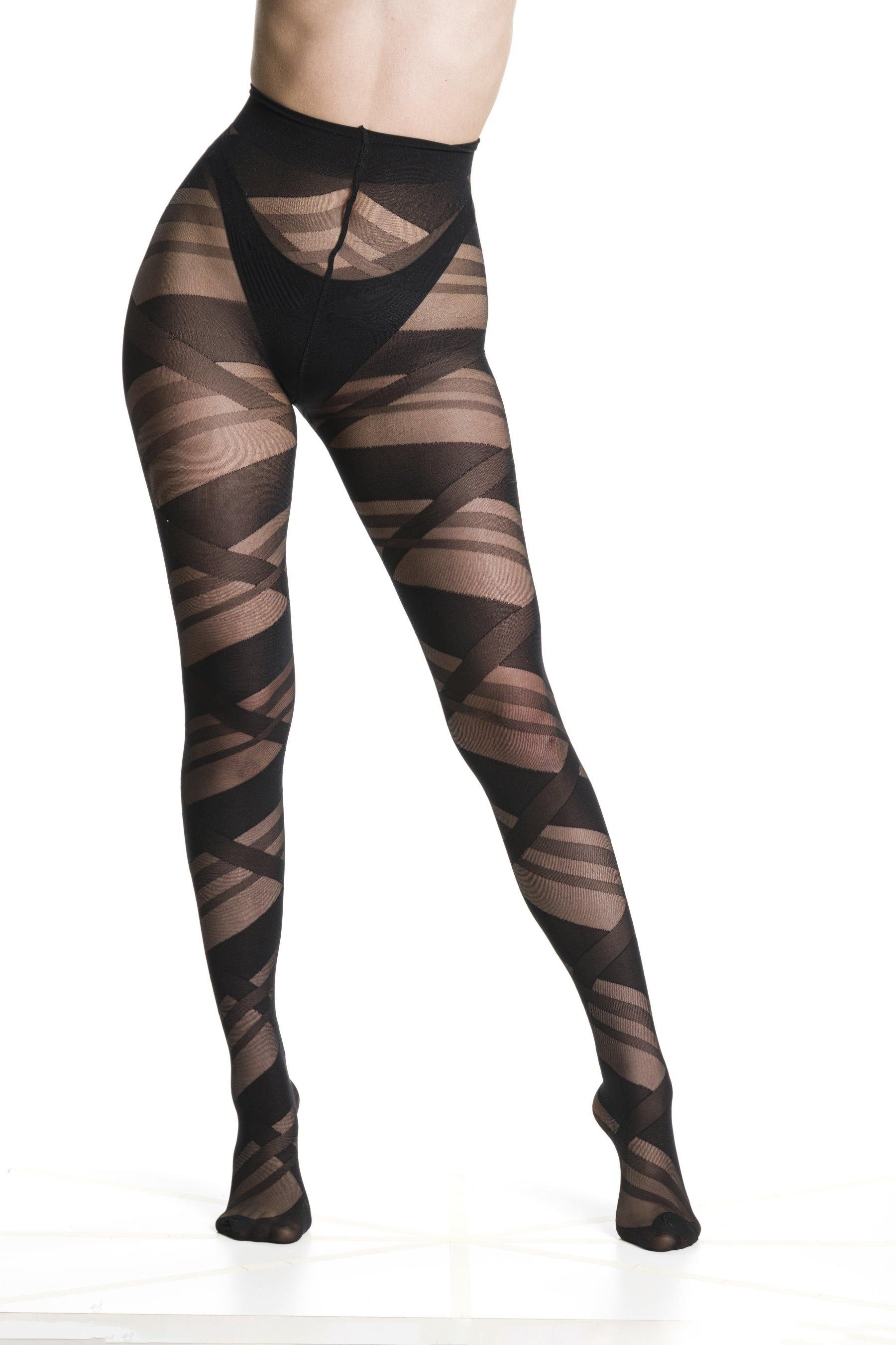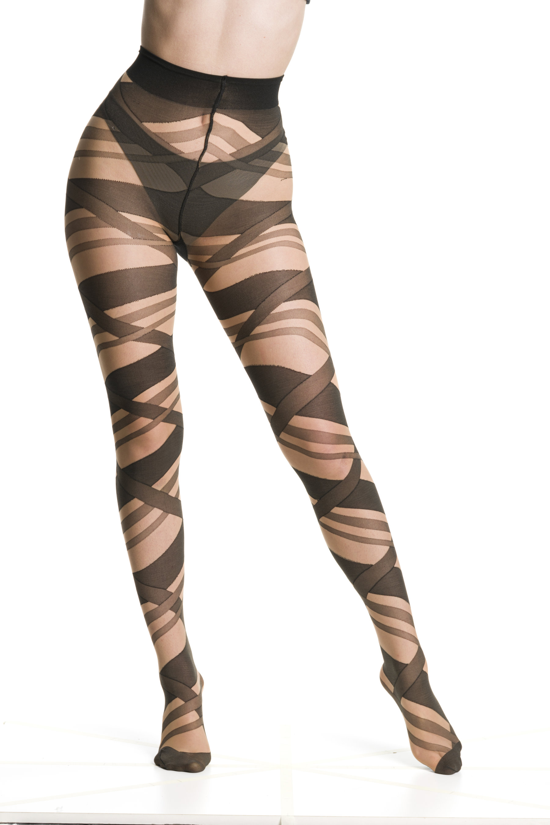 Collant fantasia a fasce intrecciate, di diverse dimensioni. Elastico confort, cucitura 4 aghi piatta, articolo fissato con forma del piede, punta rinforzata.